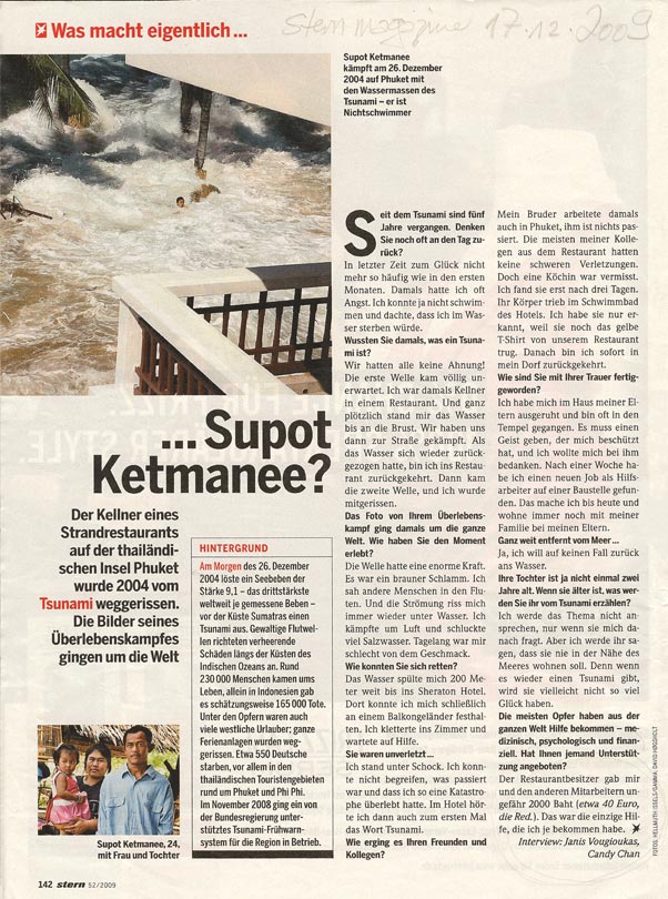 Im Stern war ein Artikel zu lesen über Supot Ketmanee einen Kellner auf Phuket. Die thailändische Insel wurde am 26. Dezember 2004